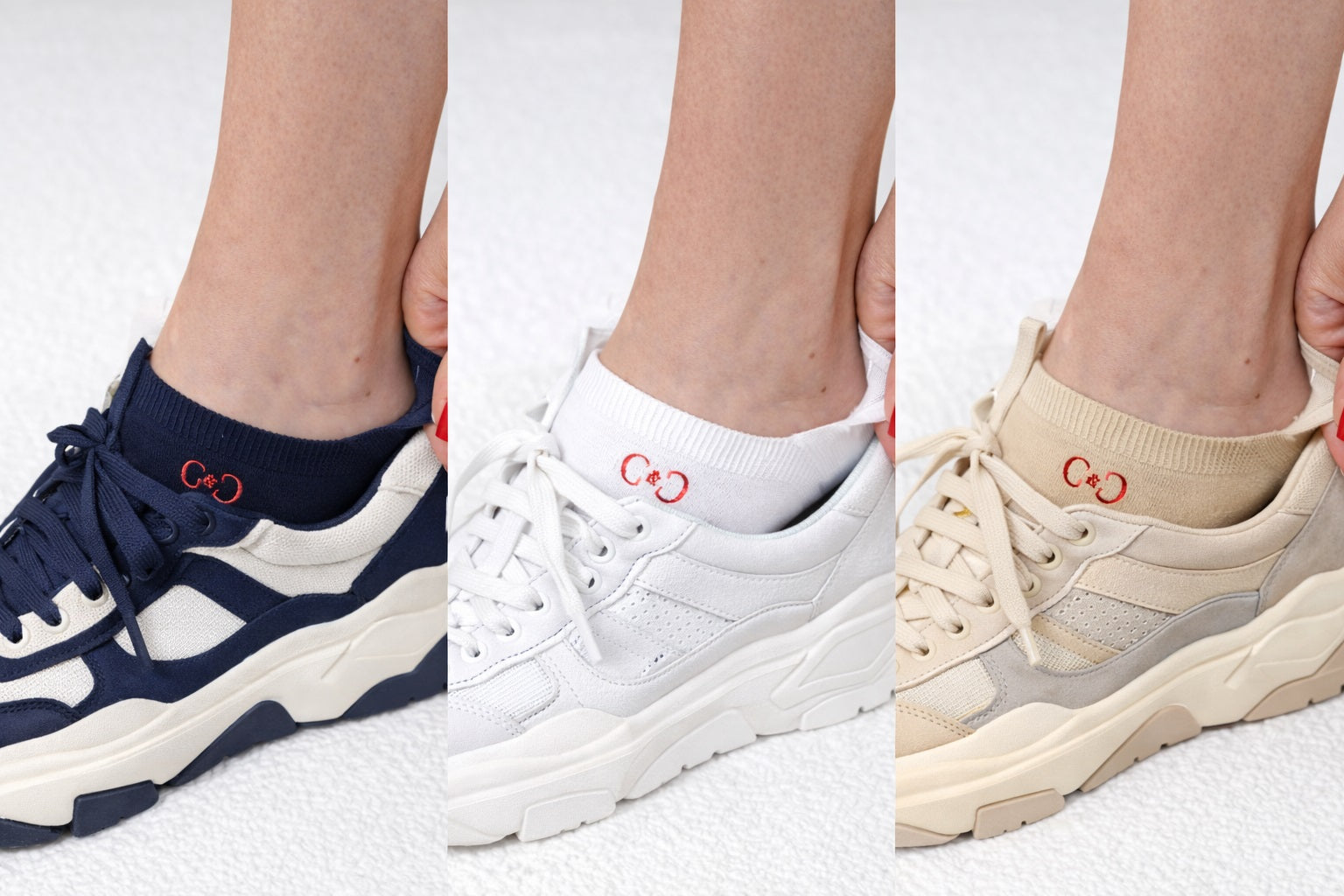 Le pack comprend 3 paires, une de chaque couleur (blanc, beige, marine). Cette triade couvre la majorité des usages : clair, nude, foncé, en fonction de vos chaussures et de votre tenue.